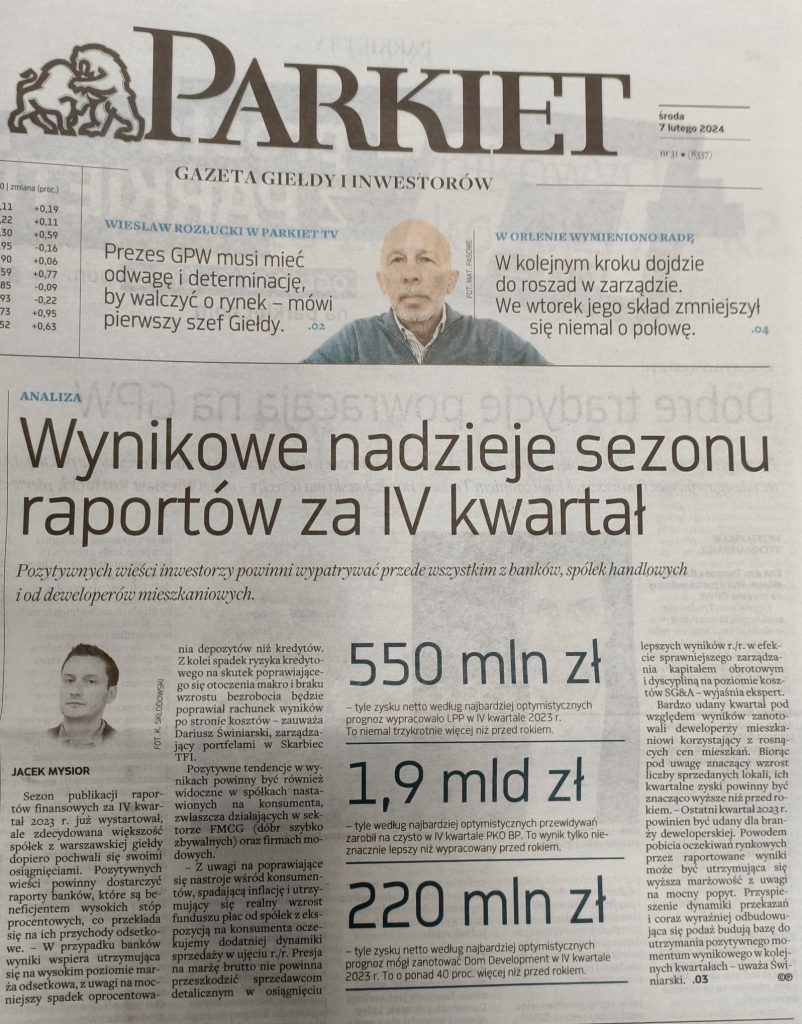 Analiza pt. „Wynikowe nadzieje sezonu raportów za IV kwartał” i komentarze Dariusza Świniarskiego w dzienniku Parkiet