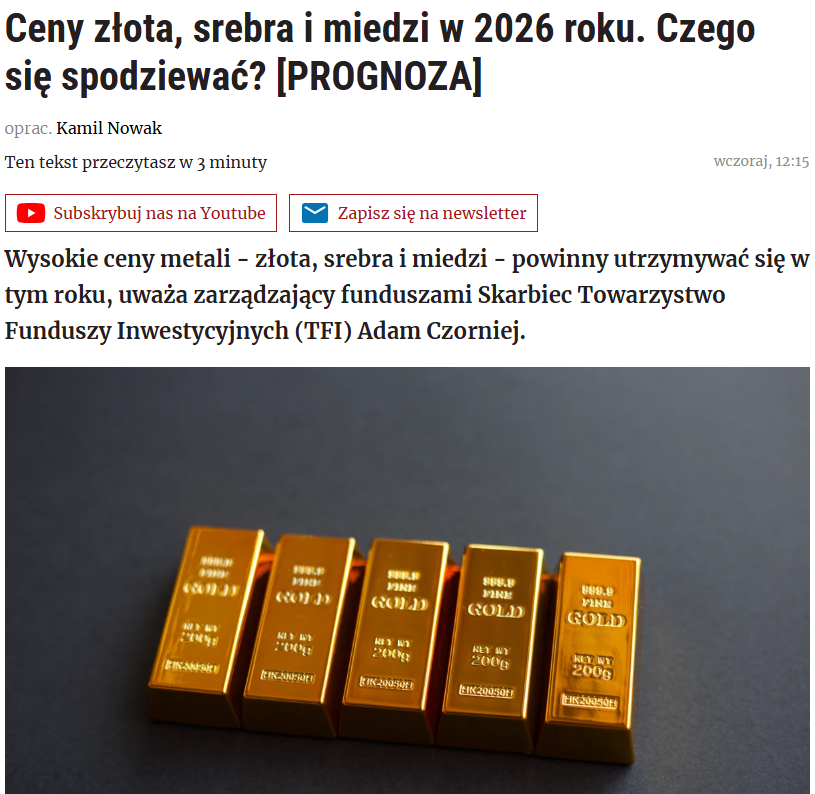 Na forsal.pl pojawił się artykuł „Ceny złota, srebra i miedzi w 2026 roku. Czego się spodziewać?” z komentarzem naszego zarządzającego Adama Czornieja.