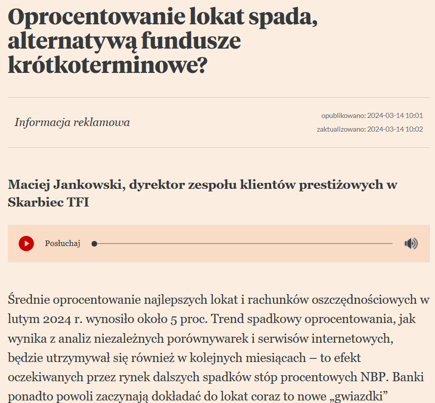 Artykuł pt. „Oprocentowanie lokat spada, alternatywą fundusze krótkoterminowe?” autorstwa Macieja Jankowskiego