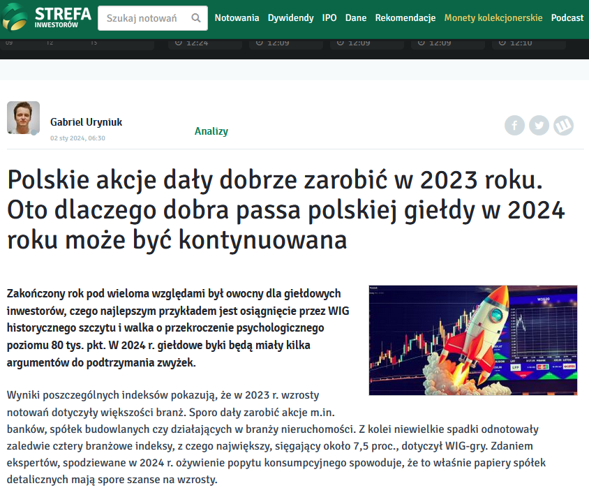 Artykuł pt. „Polskie akcje dały dobrze zarobić w 2023 roku. Oto dlaczego dobra passa polskiej giełdy w 2024 roku może być kontynuowana” i komentarze Krzysztofa Cesarza w Strefie Inwestorów