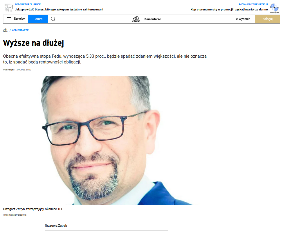 Komentarz pt. „Wyżej na dłużej” Grzegorza Zatryba w dzienniku Parkiet