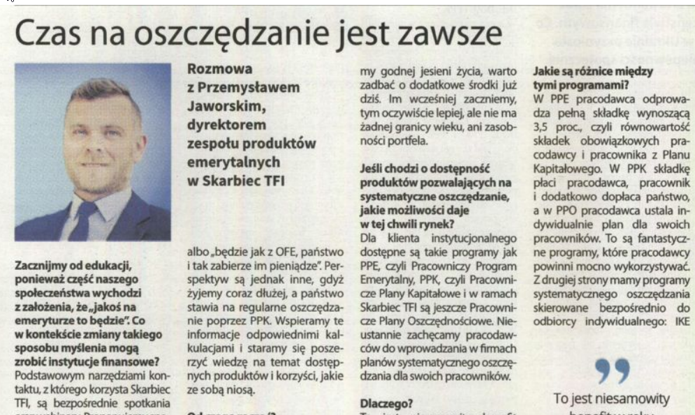 Zapraszamy do Gazety Finansowa do rozmowy z Przemysławem Jaworskim dyrektorem zespołu produktów emerytalnych w Skarbiec TFI.