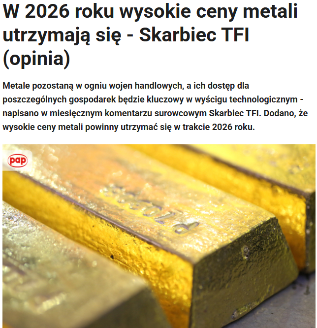 Biznes.pap.pl: Metale pozostaną w ogniu wojen handlowych, a ich dostęp dla poszczególnych gospodarek będzie kluczowy w wyścigu technologicznym – napisano w miesięcznym komentarzu surowcowym Skarbiec TFI. Dodano, że wysokie ceny metali powinny utrzymać się w trakcie 2026 roku.